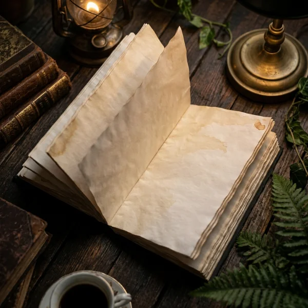 Cuenta con 150 hojas teñidas en café, elaboradas artesanalmente y tratadas una por una, lo que les da un acabado envejecido, irregular y profundamente auténtico. Ninguna página es igual a otra, como si cada una guardara su propio secreto.