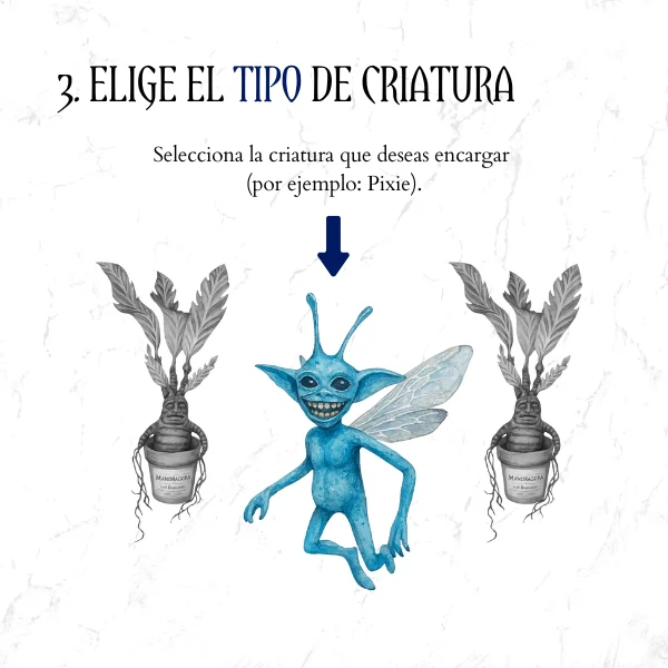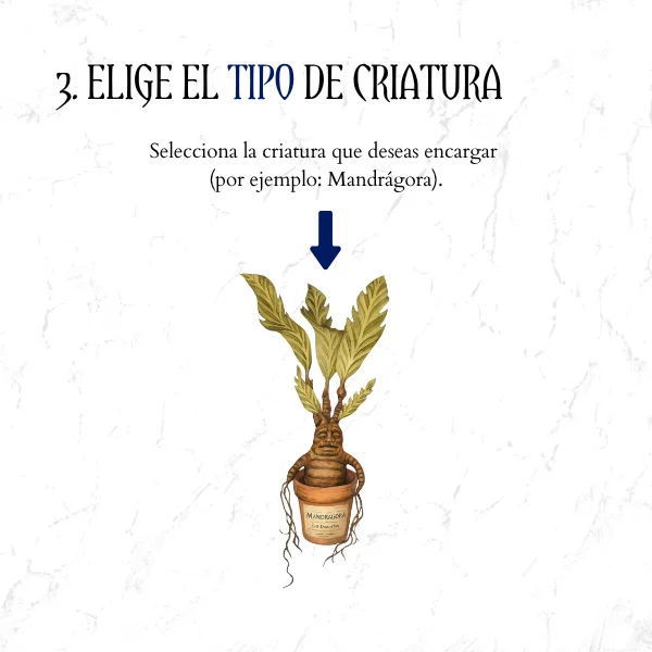 Selecciona la criatura que deseas encargar (por ejemplo: Mandrágora).