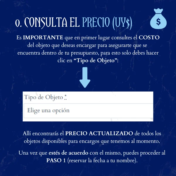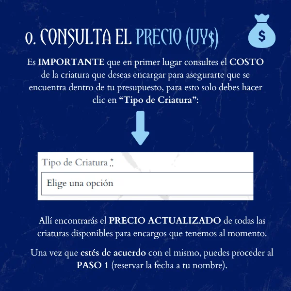 Antes de proceder, es IMPORTANTE que consultes el COSTO de la criatura que deseas encargar para asegurarte que se encuentra dentro de tu presupuesto, para esto solo debes hacer clic en “Tipo de Criatura”. Allí encontrarás el PRECIO ACTUALIZADO de todas las criaturas disponibles para encargos que tenemos al momento. Una vez que estés de acuerdo con el mismo, puedes proceder al PASO 1 (reservar la fecha a tu nombre).