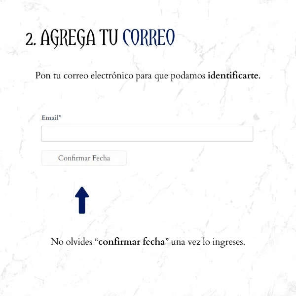 Pon tu correo electrónico para que podamos identificarte. No olvides hacer clic en “confirmar fecha” una vez lo ingreses.