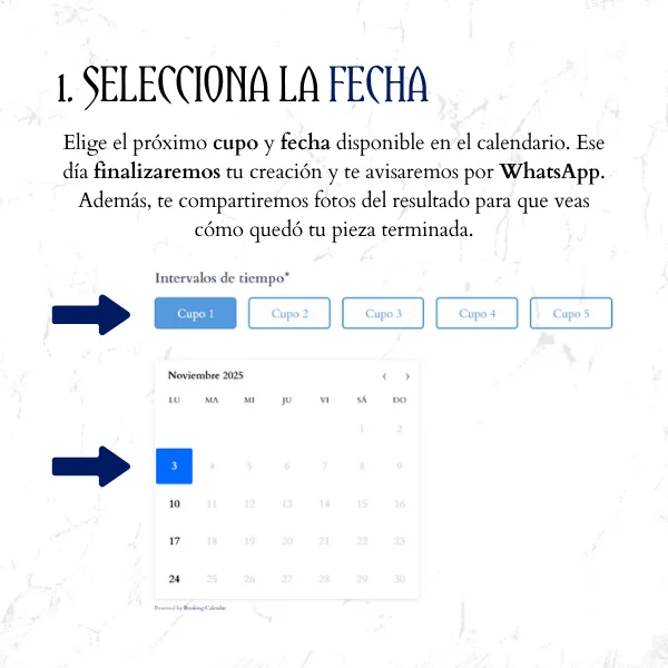 Elige el próximo cupo y fecha disponible en el calendario. Ese día finalizaremos tu creación y te avisaremos por WhatsApp. Además, te compartiremos fotos del resultado para que veas cómo quedó tu pieza terminada.