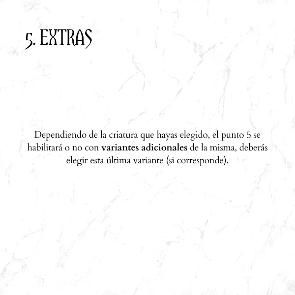 Dependiendo de la criatura que hayas elegido, el punto 5 se habilitará o no con variantes adicionales de la misma, deberás elegir esta última variante (si corresponde).