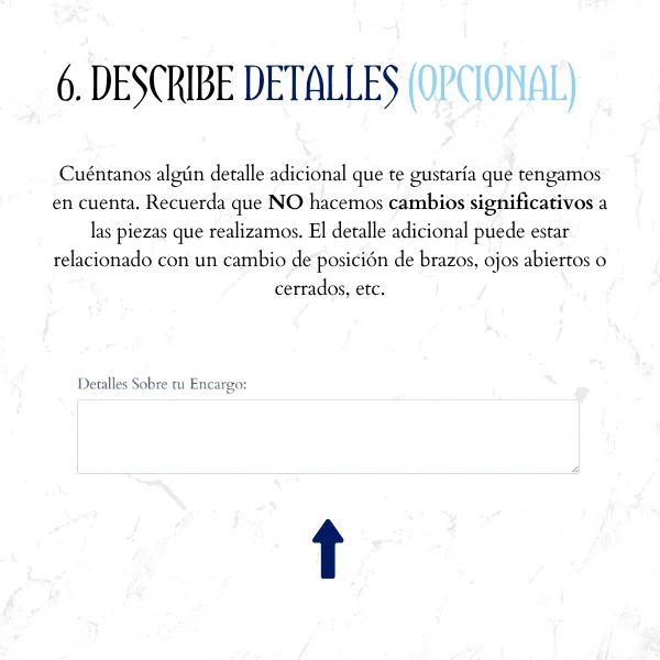 Cuéntanos algún detalle adicional que te gustaría que tengamos en cuenta. Recuerda que no hacemos cambios significativos a las piezas que realizamos. El detalle adicional puede estar relacionado con un cambio de posición de brazos, ojos abiertos o cerrados, etc.