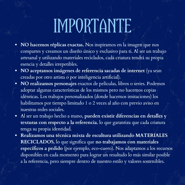 - NO hacemos réplicas exactas. Nos inspiramos en la imagen que nos compartes y creamos un diseño único y exclusivo para ti. Al ser un trabajo artesanal y utilizando materiales reciclados, cada criatura tendrá su propia esencia y detalles irrepetibles.