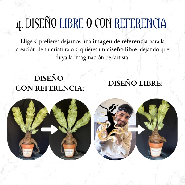 Elige si prefieres dejarnos una imagen de referencia para la creación de tu criatura o si quieres un diseño libre, dejando que fluya la imaginación del artista.