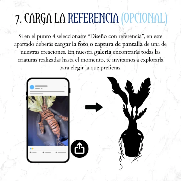Si en el punto 4 seleccionaste “Diseño con referencia”, en este apartado podrás cargar la foto o captura de pantalla de una de nuestras creaciones. En nuestra galería encontrarás todas las criaturas realizadas hasta el momento, te invitamos a explorarla para elegir la que prefieras.
