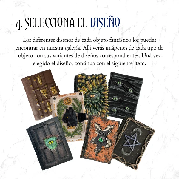 Los diferentes diseños de cada objeto fantástico los puedes encontrar en nuestra galería. Allí verás imágenes de cada tipo de objeto con sus variantes de diseños correspondientes. Una vez elegido el diseño, continua con el siguiente ítem.