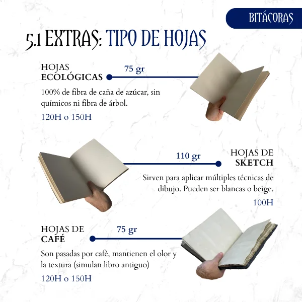 Cada bitácora es única, y el papel que elijas hará que se adapte mejor a tu estilo y necesidades. Ofrecemos tres tipos de hojas diferentes, cada una con su propio encanto y funcionalidad: