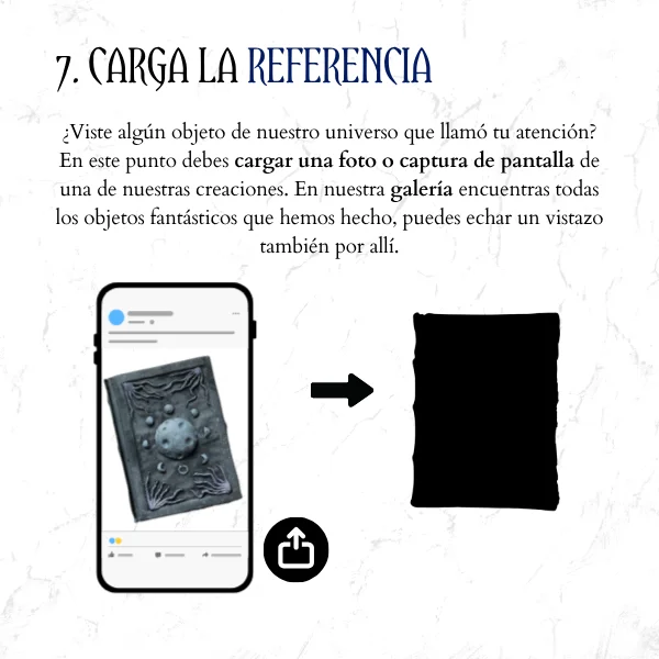 ¿Viste algún objeto de nuestro universo que llamó tu atención? En este punto puedes cargar una foto o captura de pantalla de una de nuestras creaciones. En nuestra galería encuentras todas los objetos fantásticos que hemos hecho, puedes echar un vistazo también por allí.
