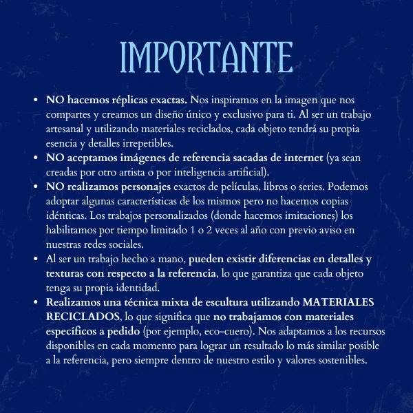 - Al ser un trabajo hecho a mano, pueden existir diferencias en detalles y texturas con respecto a la referencia, lo que garantiza que cada objeto tenga su propia identidad.